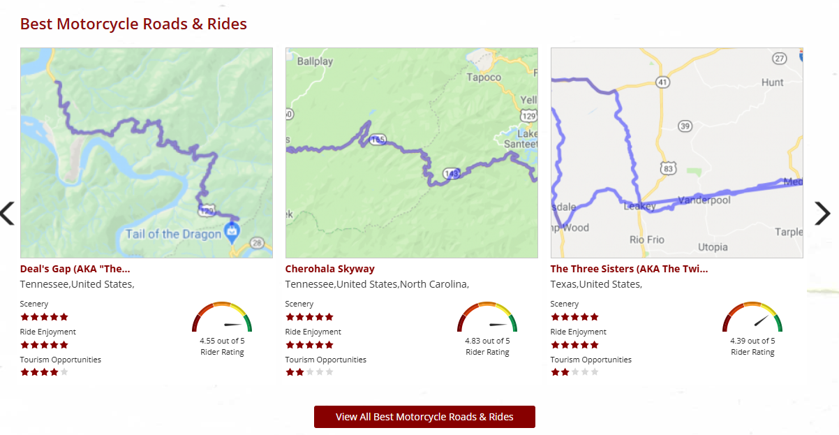 Find twisty roads based on routes, most submitted by users. Search by state, scenery, ride enjoyment and tourism opportunities. Offers reviews. Lots of functionality and no subscription required means you will see lots of ads.